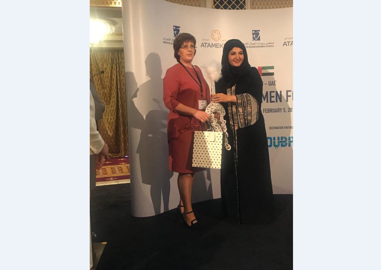 Qostanaılyq kásipker áıel qatysqan forýmǵa arabtyń bıznes-hanymy, mıllıoner Rııd Ál-Dhaherı demeýshilik jasady. Evgenııa oǵan óziniń atelesinde tigilgen sáýkeleni syılady. Qostanaılyq sheberlerdiń qolynan shyqqan qazaq áıeliniń ulttyq bas kıiminiń sándiligi forýmǵa qatysýshylardy tań qaldyrdy. Evgenııaǵa arab áıelderiniń tikken kıimderi de unady.