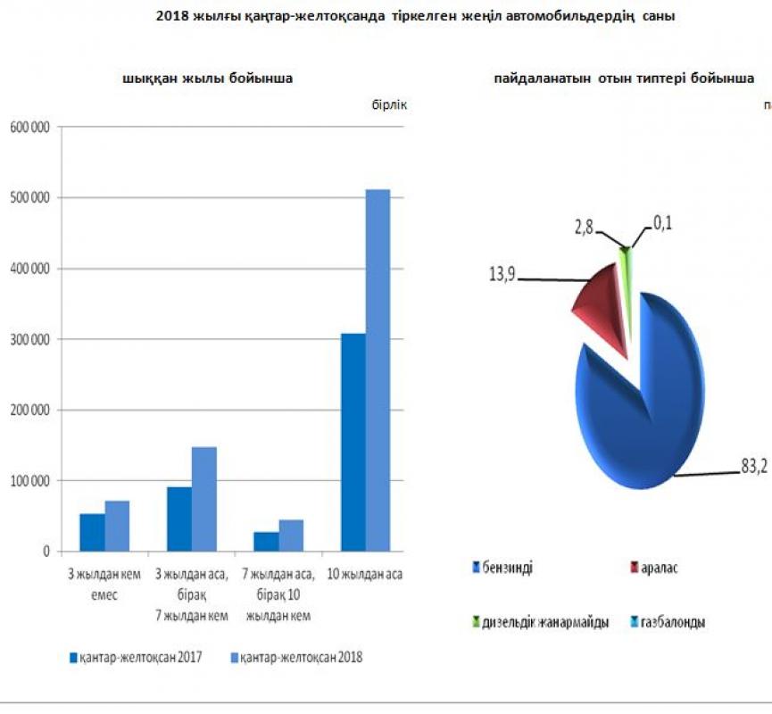 Elimizde 2019 jylǵy 1 qańtardaǵy jaǵdaı boıynsha tirkelgen jeńil avtomobılderdiń sany 3848 myń birlikti qurady.