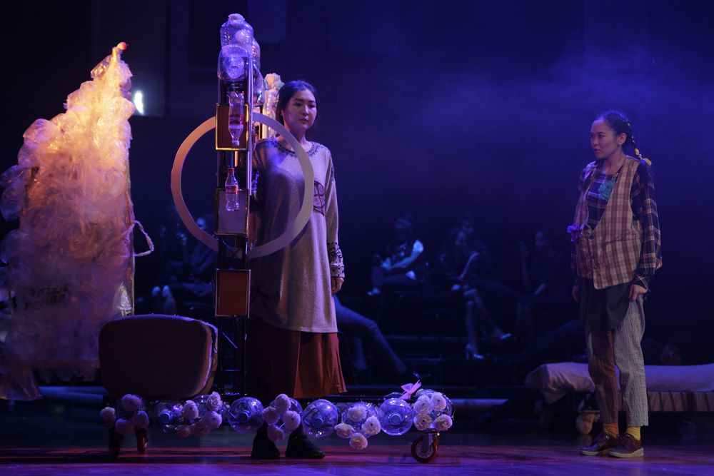 Battasqan boıaý men bar qupııasyn jaıyp sap turǵan turmystyq traktovkadan qashatyn rejısser bul joly da sharttylyqty negizge alady. Sahnada negizinen sımvol men metafora sóıleıdi. Ekige bólingen kontrasty keńistikte bir-birine qarama-qaıshy eki álem ómir súredi. Sahna ortasynan oryn alǵan ǵımarat tıptes jyltyraq áınekpen kómkerilgen alyp dekorasııa búgingi biz ómir súrip jatqan qalalyq ómirdiń quıtaqandaı ǵana bir bólshegin kórsetse, sol ǵımaratty aınala qozǵalǵan úsh beıne spektaklge qosalqy avtor bolǵan qalamgerler shyǵarmasyndaǵy keıipkerlerdiń taǵdyr-talaıy arqyly berilgen kómeskilene bastaǵan qundylyqtar kóshi. Jyltyraq álemde ómir súrgen keıipkerlerdiń bar oıy men nazary – uıaly telefon men gadjette. Aınalasynda bolyp jatqan túrli oqıǵaǵa, ózderin aınala qozǵalǵan keıipkerlerdiń qasiretti kúıi men tragedııasyna hám jan shyrylyna nazaryn salyp ta qaramaıdy. Tiri pendege ómirdiń bar qyzyǵy uıaly telefonnyń ishine turaqtap qalǵandaı.