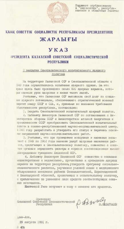 1991 jylǵy 29 tamyzda Semeı synaq polıgonynda ıadrolyq synaqtardy toqtatý úshin kúrdeli kúres tabyspen aıaqtaldy. Odaqtyq ortalyqtyń kelisýin kútpeı, Qazaq KSR-nyń Prezıdenti Nursultan Nazarbaev «Semeı ıadrolyq polıgonyn jabý týraly» Jarlyqqa qol qoıdy. Qazaqstan jappaı ıadrolyq qarýsyzdanýǵa naqty qadam jasady: Semeı ıadrolyq synaq polıgony jabyldy - joıǵysh kúshi jáne qıratý ıadrolyq áleýeti boıynsha álemde 4-shi orynda bolǵan bolatyn.