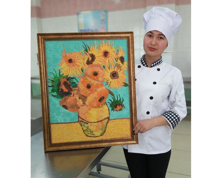 Applıkasııa ataýy latynnyń «qıystyrý», «jabystyrý» degen sózimen sabaqtasyp jatyr. Sýret túrinde oryndalǵan applıkasııa túri erterekte grek ónerinde paıda bolǵan desedi. Búginde qaı halyqtyń mádenıetinde de bul ónerdiń alatyn orny erekshe. Kózge jylylyq uıalatatyn ásem shyǵarmany keıipteýge Merýert aıǵa jýyq ýaqyt jumsapty. Bir qaraǵanda op-ońaı sekildi kóringenmen, árbir dándi túsine saı úılesimdi etip kenep betine ornalastyrý asqan tózimdilik pen uqyptylyqty qajet etedi. On alty jastaǵy stýdenttiń sýret ónerine degen qyzyǵýshylyǵy zor. Asburshaq, kúrish, júgeri, qaraqumyq, káknár, jasymyq, másh sekildi alýan tústi daqyldar kartınanyń ajaryn asha túsken. Baıqaýǵa qatysqan alpystan astam shyǵarmanyń ishinen dara shyqqan týyndysyn tálimger «О́mir nári» dep atapty.