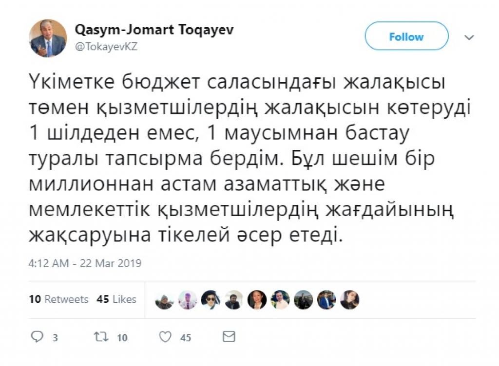 «Úkimetke bıýdjet salasyndaǵy jalaqysy tómen qyzmetshilerdiń jalaqysyn kóterýdi 1 shildeden emes, 1 maýsymnan bastaý týraly tapsyrma berdim. Bul sheshim bir mıllıonnan astam azamattyq jáne memlekettik qyzmetshilerdiń jaǵdaıynyń jaqsarýyna tikeleı áser etedi», dep jazdy Prezıdent.