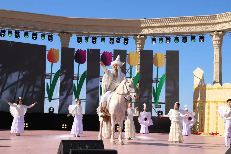 Merekelik shara 500-den astam adam qatysqan «Áz – Naýryz-tatýlyq merekesi!» atty teatrlandyrylǵan qoıylymnan bastaldy. Mańǵystaý ártisteri óz qoıylymdarynda Elbasy Nursultan Nazarbaevtyń «Uly dalanyń jeti qyry» maqalasynda aıtylǵan qazaq dalasynda ómir súrgen ejelgi kóshpeli halyqtardyń jeti qazynasyn kórsetti. Qoıylym úsh aktiden turatyn Uly Jibek joly kerýeni kórsetildi. Jaǵalaýda at, túıe, qazaqtyń tazy ıtteri men búrkitteri júrip ótti.