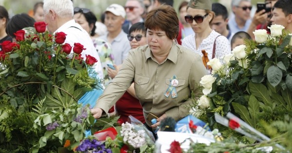 Atyraýda úsh myńǵa jýyq adam Máńgilik alaýǵa gúl shoqtaryn qoıdy