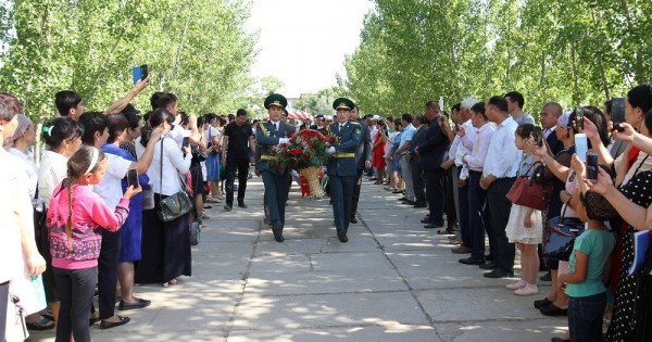 Tarıh betterinde sýyq atpen tańbalanǵan soǵys ardagerlerin ardaqtap, olardyń erlikterin dáripteý maqsatyndaǵy saltanatty is-sharada aýdan ákimi bastaǵan aýdan turǵyndary máńgilik alaýǵa gúl shoqtaryn qoıyp, ómirden ótken maıdangerlerdi bir mınýttyq únsizdikpen eske alysty.