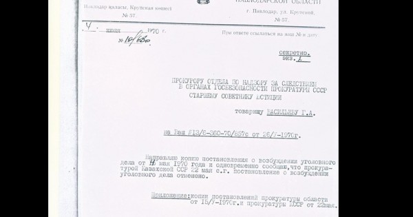 6. 1970 jyldyń 4 maýsymynda Pavlodar oblysynyń prokýrory L.N. Ivanovtyń SSSR Prokýrorynyń memlekettik qaýipsizdik organdaryndaǵy tergeýdi qadaǵalaý jónindegi orynbasary G.A. Vasılevke joldaǵan habary. Onda Pavlodar oblysynyń prokýrory sol jyldyń 4 mamyrynda qylmystyq is ashý jóninde qaýly qabyldaǵanyn, áıtse de 22 mamyrda Qazaq SSR Prokýratýrasy bul qaýlynyń kúshin joıǵany jóninde baıandalǵan.