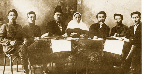 Sýrette: «Eńbekshi qazaq» gazetiniń redaksııalyq alqasy. Soldan ońǵa qaraı: Amanǵalı Segizbaev, Kenjeǵalı Ǵabdýllın, Moldaǵalı Joldybaev, Názıpa Quljanova, Sáken Seıfýllın, Taýtan Arystanbekov, Sábıt Muqanov. Orynbor q-sy. 1923-1924 jj. QR Prezıdentiniń Arhıvi. 896 q., 1 t., 3837 is.