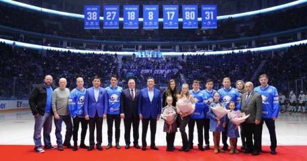 «Barys Arena» kúmbeziniń astynda klýbtyń jeti oıynshysynyń: Vıtalıı Eremeev, Nıkolaı Antropov, Aleksandr Koreshkov, Talǵat Jaılaýov, Fedor Polıshýk, BrendonBochenskı jáne Kevın Dallmennyń jeıdelerikóterildi.