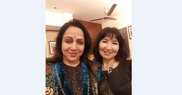 Maıra Qarsaqbaeva bastaǵan shyǵarmashylyq top Hema Malınıge qazaqtyń oıý-órnegimen ádiptelgen kúrteshesin, Almatydan arnaıy jetkizilgen aport almasyn syılady.