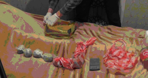 Polısııa departamentiniń habarlaýynsha, tártip saqshylary kúdiktiniń páterinen jasyl tústi zat toltyrylǵan 11 túıinshek pen elektrondy tarazy tárkilegen. Hımııalyq sot saraptamasy jasyl tústi túıinshekterdiń ishindegi zattyń gashısh esirtkisi ekenin anyqtap otyr. Páterge tintý júrgizgen polıseıler kerýet astynan 12 kalıbrli ańshy myltyǵyn tapqan.