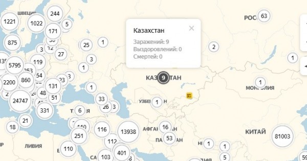 Mysaly, Qazaqstan boıynsha málimette 9 adamnyń aýrý juqtyrǵany kórsetilgen. Osyndaı kartany burynyraq AQSh-tyń Márılend shtatyndaǵy Djon Hopkıns ýnıversıtetiniń Júıeli zertteýler men ınjınırıng ortalyǵy jasaǵan bolatyn.