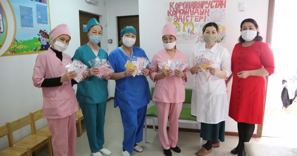 Mektep ákimshiliginiń usynysymen óner pániniń muǵalimi Almagúl Jumaeva balabaqshalardaǵy qyzmetkerlerge arnap 60 betperde tikti. Qorǵanys quraldary ár balabaqsha mamandaryna 20 danadan taratyldy. Balabaqsha qyzmetkerleri mundaı qaıyrymdylyqqa máz bolyp, mektep ujymyna alǵys bildirdi.
