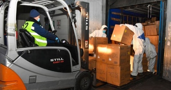 Kólemi 4,5 tonna quraıtyn gýmanıtarlyq júktiń ishinde 500 myń túrli medısınalyq maska, 5 myń qorǵanysh kostıým, 50 myń medısınalyq qolǵap, sondaı-aq túıispesiz termometrler bar.