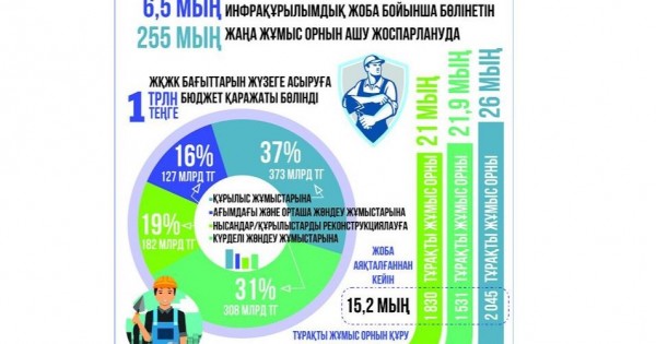 Osy tórt baǵyttaǵy jumysty júzege asyrýǵa barlyǵy 1 trln teńge bıýdjet qarajaty bólindi. Onyń 37%-y, ıaǵnı 373 mlrd teńge qurylys jumystaryna, 19%-y – 182 mlrd teńge kúrdeli jóndeý jumystaryna, 31%-y 2 308 mlrd teńge aǵymdaǵy jáne ortasha jóndeý jumystaryna, 16 %-y, ıaǵnı 127 mlrd teńgesi nysandar men qurylystardy rekonstrýksııalaýǵa jumsalady.