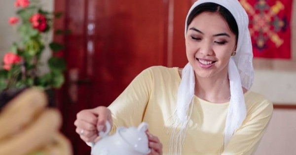 Munyń syrtynda durys, qunarly tamaqtanýy kerek ekeni, árıne, belgili jaıt. Keıin, aman-esen bosanǵan soń balasyn úlkenderdiń janynda emizýge týra kelse, bir qyryndaı otyryp tósin jasyrýy tıis. Úlkender otyrǵan dastarqanda eń tómende otyratyn jas kelin, sýsyn, shaı usynǵanda qos qoldap, nemese sol qolymen kese, tostaǵan ustaǵan oń qolynyń bilek tusyn sol qolymen demeı ustap, ınabatpen usyný kerek. Úlkenderge týra qaramaı nazaryn tómen salyp otyrýy, sýsyn ishkende, tamaq jegende bir qyryndaı otyryp, aýzyn bir qolymen kólegeılep, as shaınap otyrýy kerek degen sııaqty ózin ıbaly ustaı bilýge, adamdarmen qarym-qatynasta saq, abaı bolýǵa úıretetin tárbıelik mándi kóptegen t.b. tyıymdar bar.