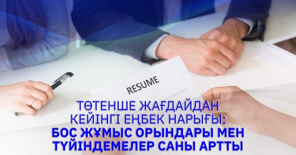 «Eńbek resýrstaryn damytý ortalyǵy» AQ málimetteri boıynsha bos jumys oryndarynyń sanynyń kúrt azaıýy naýryz aıynda baıqalǵan — 68,9 myńnan 34,2 myńǵa deıin tómendegen. Jumys izdeýshilerden kelip túsken túıindemeler sany da 29 myńnan 20,1 myńǵa deıin azaıǵan. Alaıda karantın sharalaryn kezeń-kezeńmen jeńildetý jáne kásiporyndardyń jumysqa kirisýi naryqty jandandyrdy, búginde Elektrondy eńbek bırjasynyń bazasynda 75,7 myń túıindeme ornalastyrylǵan.