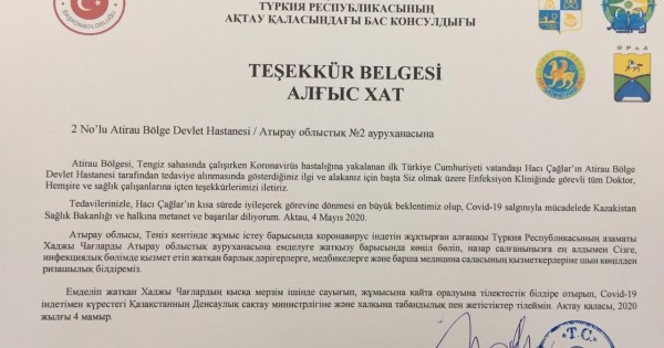 – Atyraý oblysynyń Teńiz kenishinde jumys istegen Túrkııa Respýblıkasynyń azamaty Hadjy Chaǵlardyń №2 oblystyq aýrýhanada emdelýine kóńil bólgeni úshin ınfeksııalyq bólimniń dárigerlerine, medbıkelerine, barsha medısına salasynyń qyzmetkerlerine shyn kóńilden rızashylyq bildiremiz, - depti Túrkııanyń bas konsýly alǵys hatynda.