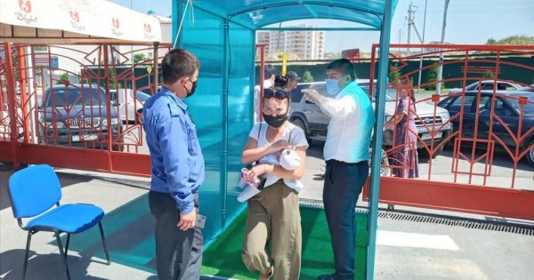 Ǵımarattyń syrtyna arnaıy shatyrlar ornatylyp, araqashyqtyǵy saqtalǵan oryndyqtar qoıyldy. Odan bólek, kireberiste dezınfeksııalyq týnnel jumys istep tur. Ár kirgen adamnyń dene qyzýy arnaıy apparatpen jiti baqylanýda.