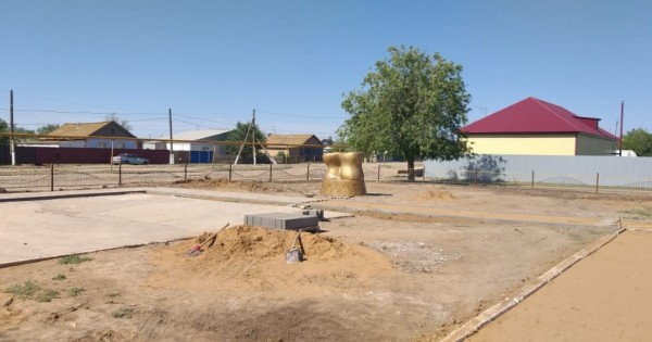 Alańdaǵy qurylys jumystaryn aqyly jumysqa tartylǵan aýyl turǵyndary atqaryp jatyr eken. Qarjy aýyldy abattandyrý arnalǵan qordan bólingen. Alańnyń kórneki jerine alshysynan túsken altyn saqa beınesi qoıylypty. Ony jasaǵan – jánibektik sheber, "Jasómir" jeke kásipornynyń ıesi Jomart Mashaev eken.