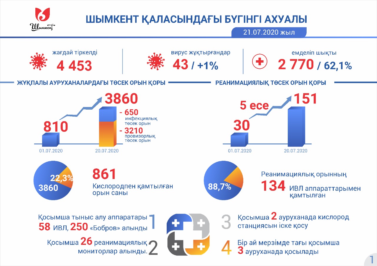 Kıslorodpen qamtylǵan oryn sany 861-ge nemese jalpy orynnyń 22,3 paıyzyna jetkizildi. Kıslorodpen turaqty túrde qamtamasyz etý máselesi de sheshilýde. Qosymsha 2 aýrýhanada kıslorod stansııasyn iske qosý jumystary júrgizilýde. Bir aı merzimde taǵy 3 aýrýhanada qosylatyn bolady.