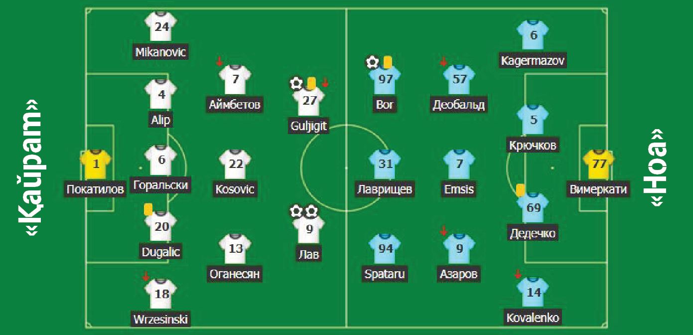 Oıynnyń segizinshi mınýtynda reseılik jartylaı qorǵaýshy Kırıll Bordyń arqasynda «Noa» kútpegen jerden alǵa shyqqanymen, «Qaırat» oıynshylary tez esin jıyp, araǵa tórt mınýt salyp Qyrǵyzstan ulttyq quramasynyń jartylaı qorǵaýshysy Gúljigit Alyqulov gol soqty. Esep – 1:1.