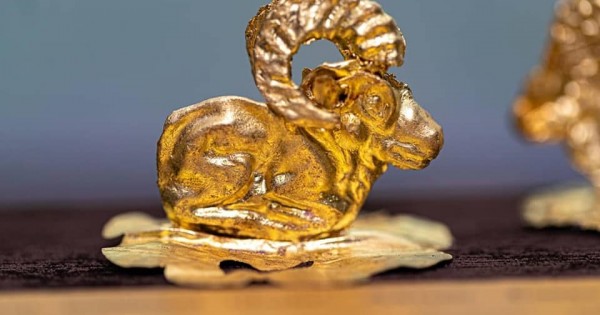 "Ań" stılindegi áshekeı buıymdar qorǵannyń qasyndaǵy qulshylyq etetin ornynan shyqqan. Zer salyp qarasaq, grıfondardyń, buǵylardyń, mıstıkalyq janýarlardyń músinderi asa sheberlikpen jasalǵan. Altyny da tyǵyz kórinedi. Aı qulaqty jolbarys úlgisindegi alqa da zergerdiń has sheberligin kórsetip turǵandaı.