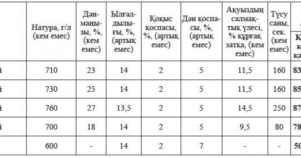 Basqa kórsetkishter bıdaı boıynsha QR ST 1046-2008, arpa boıynsha QR ST 2119-2011 standarttaryna sáıkes keledi.