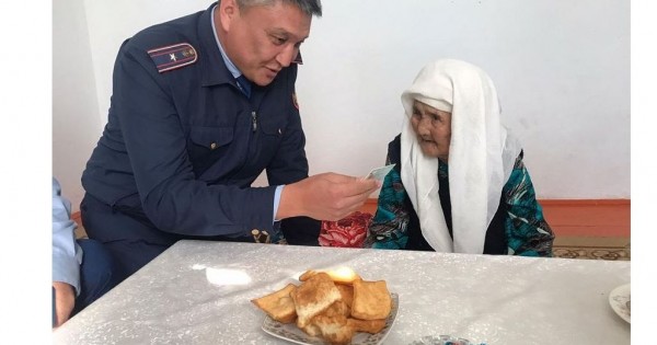 Өз кезегінде жетісайлық 100 жастағы ана құжаттарын жасап берген полицейлерге алғысын білдіріп, жұмыстарына табыс тілеп, ақ батасын берді.