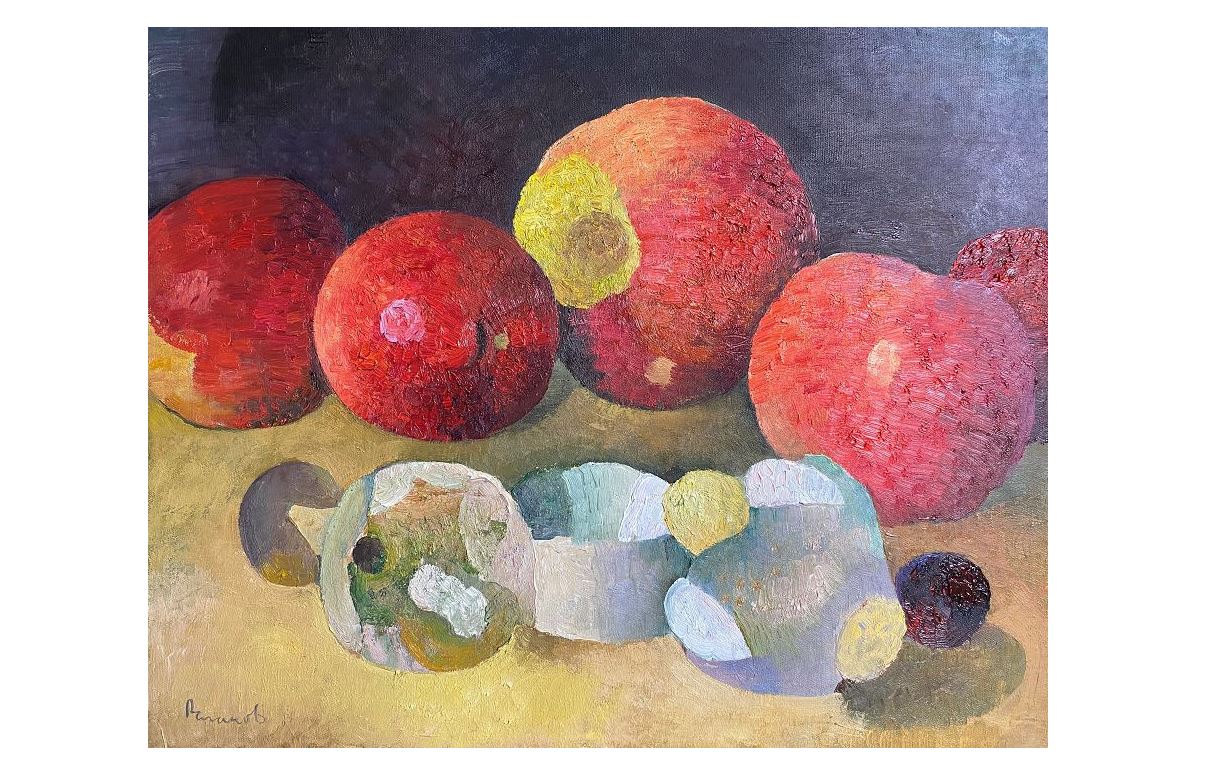 – Joǵarǵy plandaǵy sary tústi úlken alma kúnniń beınesi, al janyndaǵy jemister kún júıesindegi ǵalamsharlar. Natıýrmorttaǵy negizgi oı ol aldyńǵy plandaǵy úlken qyzyl alma – jer ǵalamshary. Baıqasańyzdar jerdiń qazirgi jaǵdaıyn dál kórsetken. Onyń oıqysh ta, qurt túsken beınesi planetamyzdyń qazirgi kúıinińkelbeti. Natıýrmort sheberi kóbinese alma, almurt, qumyra jáne t.b. zattarmen jumys isteıdi. Týyndylaryndaǵy zattardyń ornalasýy qurylymdyq tártipte, keńistiktiń barlyq qaǵıdalaryn ustanady. Zattardyńpishinderine jete toqtalyp keıde, jeke pishinge nazar aýdarylady. Bir qaraǵanda qarapaıym natıýrmort bolyp kóringenimen, maǵynasy men sıýjettik máni bólek. Shyǵarmashylyǵyndaǵy negizgi ról – tústik-túzilim, – deıdi kórme jetekshisi Aqjigit Núsip.