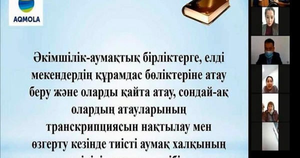 Qatysýshylar 2015-2020 jyldar aralyǵynda onomastıka salasynda atqarylǵan jumystar (jalpy aýdandaǵy ataýlar, qaıta atalǵany, ataý berilgeni, ıdeologııalyq turǵydan eskirgen ataýlar, t.s.s), túsindirý jumystary, tarıhı ataýlardy anyqtaý jumystary qamtylǵan, tolyq taldaý júrgizilgen 7 mınýttyq slaıd daıyndady. «Qazaqstan Respýblıkasyndaǵy tilder týraly» Zańynan, onomastıka salasyn retteıtin normatıvtik quqyqtyq aktilerden, «Qazaqstan Respýblıkasyndaǵy til saıasatyn iske asyrýdyń 2020-2025 jyldarǵa arnalǵan memlekettik baǵdarlamasynan» qoıylǵan suraqtarǵa jaýap berdi.