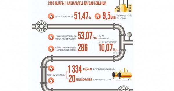 2020 jylǵy 1 qańtardaǵy jaǵdaı boıynsha eldi gazdandyrý deńgeıi 51,47%-dy qurady nemese 9,5 mln adam kógildir otynǵa qol jetkizdi. 2020 jyldyń qorytyndysy boıynsha gazdandyrý deńgeıin 53,07%-ǵa jetkizý kútilýde, bul 2015 jylǵy deńgeıden 10,07%-ǵa artyq. Sóıtip, 2015-2020 jyldar kezeńinde gazdandyrylǵan eldi mekenderdiń ósimi 286 birlikti, halyqtyń ósimi 2,4 mln adamdy quraıtyn bolady. Sondaı-aq sońǵy 5 jylda 1 334 shaqyrym magıstraldyq gaz qubyrlary jáne 20 myń shaqyrymnan astam gaz taratý jelileri salynǵan.