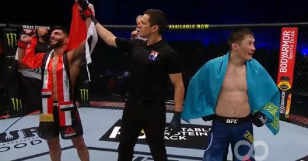 32 jastaǵy Jalǵas úshin bul UFC-degi ekinshi kezdesýi edi. Tusaýkeser kezdesýin ol osydan jarty jyl buryn ótkizip, brazılııalyq Raýlıan Paıvaǵa ese jiberdi. Barlyǵy 18 márte oktagonǵa shyǵyp, 13 básekede basym túsken saqa sportshymyz bul joly Ámir Albazımen kúsh synasty. 27 jastaǵy qarsylasy Shvesııanyń týy astynda óner kórsetkenimen, Irakta dúnıege kelgen. Osy kúnge deıin ol 15 kezdesý ótkizip, tek bireýinde ǵana utyldy. Báseke basynan aıaǵyna deıin bir tempte ótti. Birde Jumaǵulov, birde Albazı shıraq qımyldady. Desek te sońǵy raýndta Ámir Jalǵasty jyǵyp alyp, qylqyndyrý tásilin oryndaýǵa talpyndy. Qandasymyz oǵan ondaı múmkindik bermedi. Sońǵy mınýtta qos sportshy tik turyp aıqasty. Jekpe-jek aıaqtalǵannan soń barlyq úsh tóreshi biraýyzdan Skandınavııa túbeginen kelgen sańlaqty jeńimpaz dep tanydy.