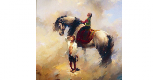Avtor bala shynaıylyǵynyń ushqyny men tabıǵılyǵyn, álemdi tanýǵa degen qyzyǵýshylyǵyn erkin sezinip, móldiretip jetkizgen. At ústinde aspanǵa qol sozǵan bala arman kartınanyń jumbaǵyn sheship turǵandaı.