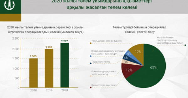 2020 jyldyń qorytyndysy boıynsha tólem uıymdarynyń servısteri arqyly 2,3 trln teńge somaǵa 430,1 mln tranzaksııa júrgizildi. 2019 jylǵy kórsetkishtermen salystyrǵanda, soma 15%-ǵa ulǵaıǵan kezde operasııalar sany 7%-ǵa tómendedi. Bul tólemderdiń 64,5%-y 1,5 trln teńge uıaly baılanys operatorlarynyń qyzmetterine aqy tóleý maqsatynda 2019 jyldyń sáıkes kezeńiniń kórsetkishterinen 26,4%-ǵa asyp ótkizildi.