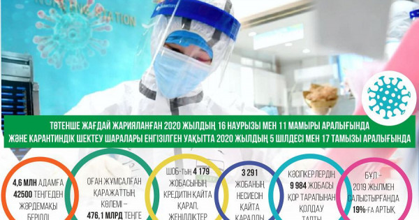 Elimizde tótenshe jaǵdaı jarııalanǵan kezde tabysynan aırylǵan azamattarǵa Úkimet eń tómengi aılyq sheginde 42 500 teńge tóledi. Eńbek jáne halyqty áleýmettik qorǵaý mınıstrliginiń baspasóz hatshysynyń málimetinshe, tótenshe jaǵdaı jarııalanǵan 16 naýryz ben 11 mamyr aralyǵynda jáne karantındik shekteý sharalary engizilgen ýaqytta (2020 jyldyń 5 shildesi men 17 tamyz aralyǵynda) bul járdemaqyny 4,6 mln adam alǵan, oǵan jumsalǵan qarajattyń kólemi – 476,1 mlrd teńge.
