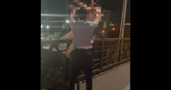 Tártip saqshylarynyń biri azamatshany áńgimege tarta bastaǵanda, ekinshi qyzmetker áıeldi qaýipsiz orynǵa shyǵarady.