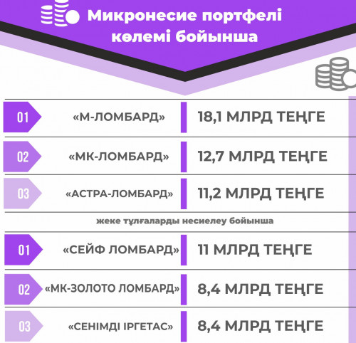 Qarjy naryǵyn retteý jáne damytý agenttiginiń dereginshe, bıyl ekinshi toqsan sońynda elde 594 lombard jumys istegen. Mıkronesıe portfeli kólemi boıynsha «M-Lombard» (18,1 mlrd teńge) kósh bastaıdy, ekinshi orynda – «MK-Lombard» (12,7 mlrd teńge), úshinshi orynda – «Astra-Lombard» (11,2 mlrd teńge). Sondaı-aq jeke tulǵalardy nesıeleý boıynsha «Seıf Lombard» (11 mlrd teńge), «MK-Zoloto Lombard» jáne «Senimdi irgetas» (8,4 mlrd teńgeden) lombardtarynyń da úlesi joǵary.