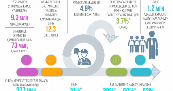 Eńbek jáne halyqty áleýmettik qorǵaý mınıstri Serik Shápkenovtiń aıtýynsha, bıyl ótken jylmen salystyrǵanda eńbek naryǵynyń birtindep qalpyna kelýi jalǵasýda, onyń negizgi kórsetkishteri jaman emes. «Ulttyq statıstıka bıýrosynyń málimetterine sáıkes bıylǵy 2 toqsanda jumys kúshiniń sany 9,3 mln adamdy qurady. Onyń ishinde jumyspen qamtylǵandar sany 73 myń adamǵa artty. Salalar boıynsha jumyspen qamtylǵandardyń qatarynda qyzmet kórsetý salasynyń úlesi basym. Jumys berýshiniń bastamasymen ýaqytsha jumyspen qamtylmaǵandar sany 12,3 esege kemidi», dedi S.Shápkenov.