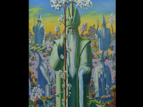 Kelesi bir ápsanaǵa súıensek, Qydyr ata shól dalada tamaǵy qurǵap, ystyqtan ólip bara jatqan saıahatshylardy qutqaryp qalǵan eken. Shyǵarmada kenep boıymen sý aǵyndary tasyp jatqanyn baıqaımyz. Onyń sheshek atqan aǵashtardy, shyryndy shóptiń arasynda jaıylyp jatqan janýarlardy sýǵarýǵa kelgenin kóremiz. Ártúrli obrazda tirshiliktiń tamyrshysy retinde Qydyr ata kartınanyń mazmunyn jandandyryp tur.