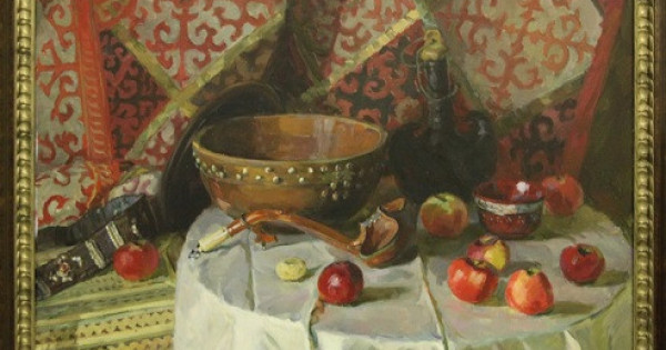 Onyń natıýrmorty birte-birte ulttyq sıpatqa ıe bola bastady. «Qymyz quıatyn tostaǵan» kartınasynda oıýly kilem fonyndaǵy kompozısııa ortasynan qazaqy dóńgelek ústeldi kóremiz. Oǵan aq dastarqan jaıylyp, ústine temir japsyrmalarmen bezendirilgen aǵash zeren, súıek sapty ojaý, torsyq, kese syndy qazaqtyń ulttyq as úı jabdyqtaryn qoıǵan jáne pisken ádemi almalardy shashyp tastaǵan. Ústeldiń janynda oıyp órnektelgen sandyq, al onyń ústinde áshekeıli japsyrmalary men jartylaı asyl tastar ornatylǵan tilimsheleri bar qaıys beldik jatyr.