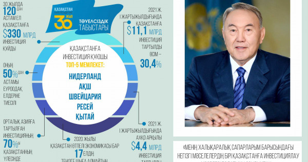 Túıindeı kele aıtarymyz, Tuńǵysh Prezıdent – Elbasy Nursultan Nazarbaevtyń «Qazaqstandy ınvestısııalyq tartymdy elge aınaldyramyn» degen asqaq armany oryndaldy. Onyń ıgiligi búgingi býynǵa ǵana emes, keler urpaqqa da jetetini zor qýanysh! О́ıtkeni munyń bári bir kúndik emes, júzjyldyq kezeńge jalǵasar ıgilik.