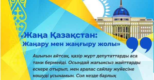Eldi eleń etkizgen úlken jańalyq – qaıta qurylǵan oblystarǵa qatysty sheshimder boldy. Semeıdi Alash qozǵalysynyń ortalyǵy retinde, Ulytaýdy – qazaq memlekettiginiń tarıhı oshaǵy, úlken tarıhı ıdeologııalyq faktor retinde atap ótýi óte mańyzdy. Elimizdiń rýhanı, mádenı, ádebı áleminde erekshe oryn alatyn, tarıhy tereń óńirler oblys ortalyǵy mártebesin qaıta ıelenýimen ekinshi tynysy ashylatynyna daý joq. Oǵan ortalyq mártebesin alǵan Taldyqorǵan, Kókshetaý, Túrkistan qalalaryndaǵy jaqsy úderisterdi mysal retinde aıtýǵa ábden bolady. Endeshe, atalǵan óńir turǵyndarymen birge barsha qazaqstandyqtardy osynaý tamasha tabystarymen quttyqtaǵym keledi.