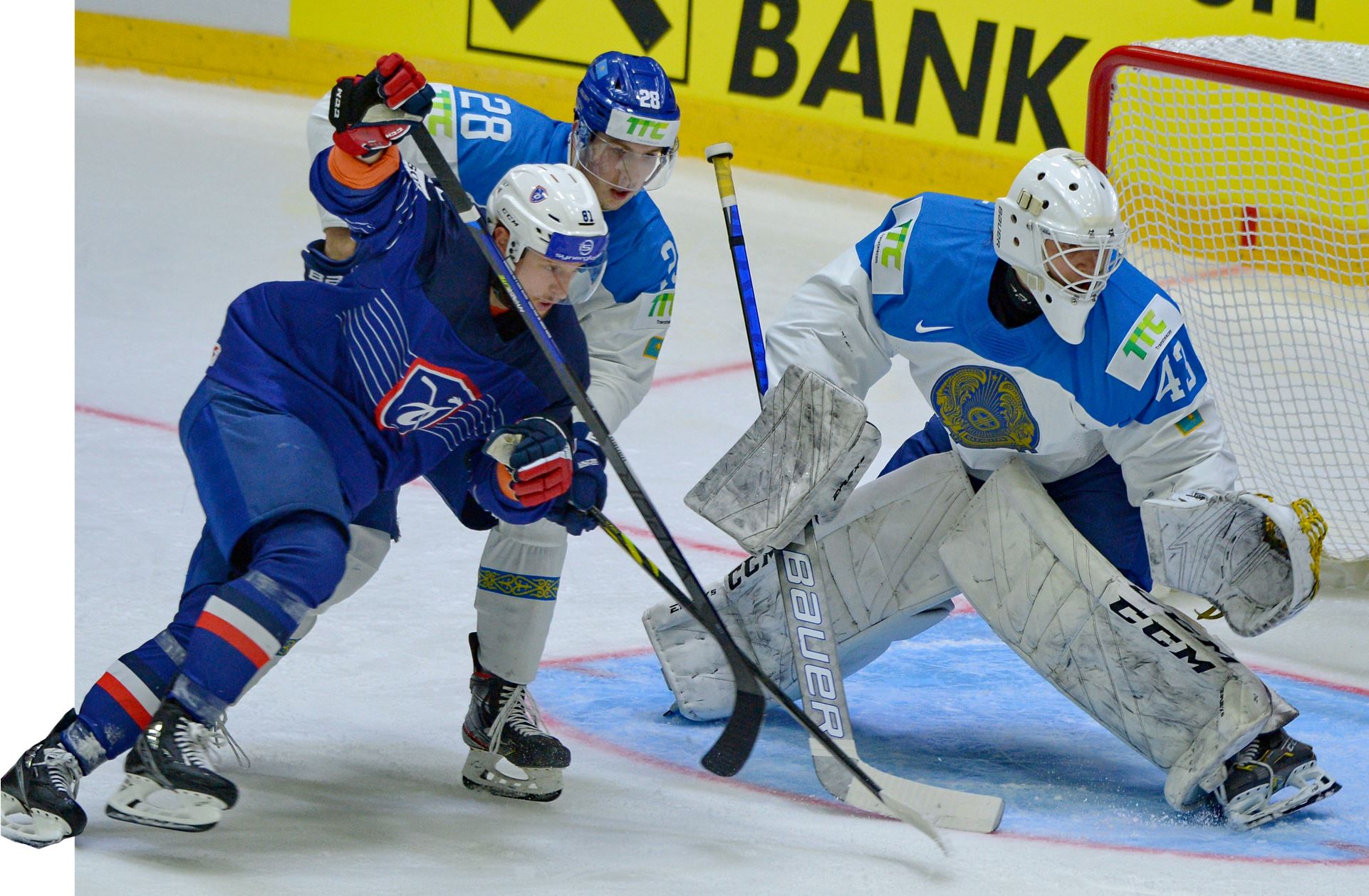 Alǵashqy kezeń 1:0 esebimen Qazaqstan quramasynyń paıdasyna aıaqtalǵanymen, Andreı Shýtov qyraǵylyq tanytpaǵanda, birinshi 20 mınýt teń eseppen aıaqtalýy múmkin edi. Áıtkenmen, fransııalyqtar birinshi kezeńde sala almaǵan shaıbasyn ekinshi kezeńde artyǵymen soqty. 32-mınýtta Aleksandr Tekser mergendik tanytyp, tarazy basyn teńestirse, ekinshi kezeńniń aıaqtalýyna 25 sekýnd qalǵanda san basymdyǵyna ıe bolǵan «úsh jolaqty» eldiń hokkeıshileri qaqpamyzǵa ekinshi shaıbasyn toǵytty. Goldyń avtory – Florıan Shakıashvılı. Sheshýshi, sońǵy kezeńde Qazaqstan quramasy esepti teńestirýge qansha tyrysqanymen, olarynan esh nátıje shyǵara almady. Qorytyndy esep – 1:2.