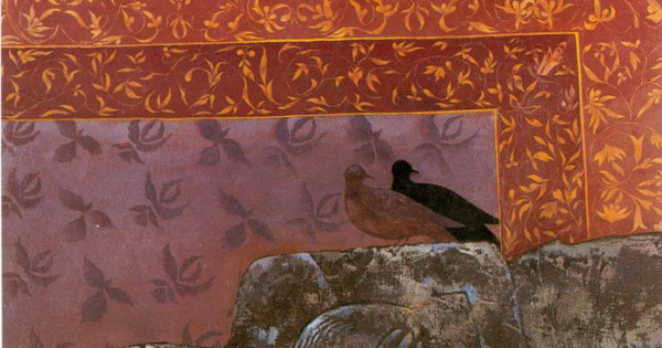 Baqsańyz, kenep betinde tik formatta tas balbal kóldeneńinen sulap jatyr. 1986 jylǵy qaıǵyly jaǵdaı sýretshiniń júreginen osylaı ótedi. Balbal fonynda shyǵystyq mánerde ósimdik tektes oıýlarmen órnektelgen kilem ilingen. Kilem qyzǵysh sary tústen kúreń qyzyl túske deıin qubylady. Qaýipti naýqas balbaltas pishinde tuspaldanyp berilgen. Alaıda kúńirenip túıgen qabaǵy oqyrmanǵa aıqyn kórinedi. Balbal baba tastan jaralǵan júrek tusyn qushaqtap qyrynan jatyr. Onyń ústine kepterge uqsas qus qonaqtaǵan. Qustyń kóleńkesi erekshe aıshyqtalyp qoıý qara túste kilem betine túsken. Ol da bulyńǵyr.