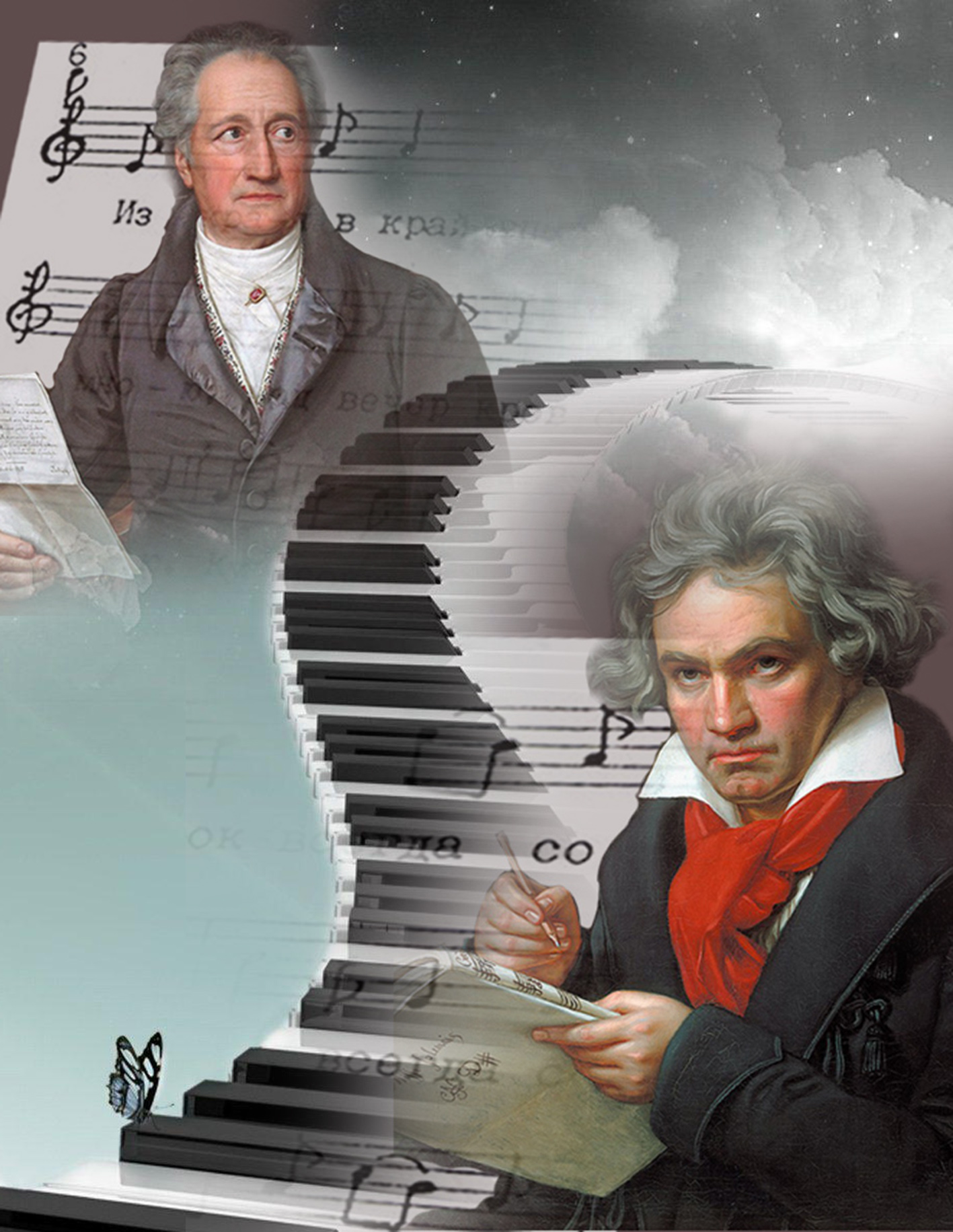 Kitapta Bethoven men Gete jónindegi oqıǵa qamtylǵan. Baısaldy, baıypty aqyn men ushqalaq, qyzba kompozıtordyń jolyǵýy kezdeısoq emes. Bethoven Gete shyǵarmashylyǵyna bas ıip, talantyna tabynatyn. 1811 jyldyń 12 sáýirindegi aqynǵa jazǵan hatynda: «Sizdi bala kúnnen, uzaq ýaqyttan beri tanımyn – bul sonshalyq az ári sonshalyq uly!» deıdi. Aqyry qos alyp júzdeser kún de jetedi. 1811 jyly jaz aıynda Bethoven Chehııanyń soltústik-batysyndaǵy Teplıs qalasynda turady. О́zin jalǵyzdyq uıasyna qonǵandaı sezinip, jabyrqaǵan kompozıtor Getemen kezdesýge sheshim qabyldaıdy. Eki taý qosylǵandaı, eki ózen bir arnaǵa toǵysqandaı áserli kezdesý ótedi. Tynbastan, tapjylmastan birneshe saǵat dúrkin-dúrkin áńgime aıtyp, pikirlesedi. Árqaısy jaıly tolaǵaı sóz aıtylyp, kezdesý ekinshi kúnge, tipti úsh kúnge sozylady. Bethoven fortepıanoda oınap, ónerin pash etedi. Kóp ótpeı tarıhqa engen oqıǵa qylań berip, anadan bólek týǵan danyshpandardyń minez qyrlary kórinedi. Ekeýi serýen quryp, ózi jaıly, iri hám qarapaıym eńbek adamdary jaıly, óner men búgingi saıasat haqynda áńgime quryp júrgen bolatyn. Kenet qalalyq baq mańynan qorǵaýshylarymen birge serýendep júrgen patshaıym kórinedi. Pań Bethoven ózderiniń kórnekti tulǵa ekenin, patshaıymnyń janynan basymyzdy tik kóterip ótsek jarasady degen syńaıda Getege sóz aıtyp, júrisinen jańylmaıdy. Biraq Gete buǵan kelispeı, qurmet kórsetý retinde qalpaǵyn alyp, aqsúıek patshaıymǵa sypaıy ǵana qurmet bildirý úshin joldyń shetine shyǵyp turady. Bethoven Geteniń bul isine bultty kúndeı túnerip, eleýsiz ǵana bas ızep, patshaıymnyń janynan pań kúıde jyldam óte beredi. Keleńsiz oqıǵa jóninde keıinnen Bethoven: «Men patshalar aqyndardy qarsy alady dep oılaǵanmyn, biraq aqyn patshany qarsy aldy» deıdi. Al Gete bolsa: «Bethoven – asa súıkimdi deýge kelmeıtin adýyndy tulǵa. Álbette alǵyr ári aqyldy jan, ol myna álemdi kespirsiz dese, onymen kelispeý qıyn. Alaıda bul kespirsiz álemge Bethovenniń jasaǵan alaqandaı qarsylyǵy, álemdi jaıdarly etip jibermeıtinin aıtýǵa májbúrmin» deıdi.