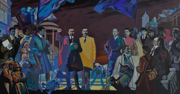 Ortalyq qaharman, ult kósemi Á.Bókeıhan erekshe sary túspen belgilengen. Osy arqyly ortaǵa nazar aýdartyp, kórkemdik tartymdylyq kúshiniń tabıǵı jarasymdy birligin dáleldegen. Sýretshi sony poetıka jasaý kerektigin jaqsy uǵyp, ulttyq kolorıt úshin erekshe sazdylyqpen, áýen arnasynda órbite bildi. Boıaýdyń gammasy, tondarynyń ǵajap sıqyrly utqyrlyǵy, medıtasııalyq boıaýlarmen beınelegish áýezdilik tásili de tereń. Alash qozǵalysy ult-azattyq qozǵalys retinde birtutas, maqsatty saıası, áleýmettik, mádenı úderis bolǵanyn kartınada tolyq ańǵartqan.