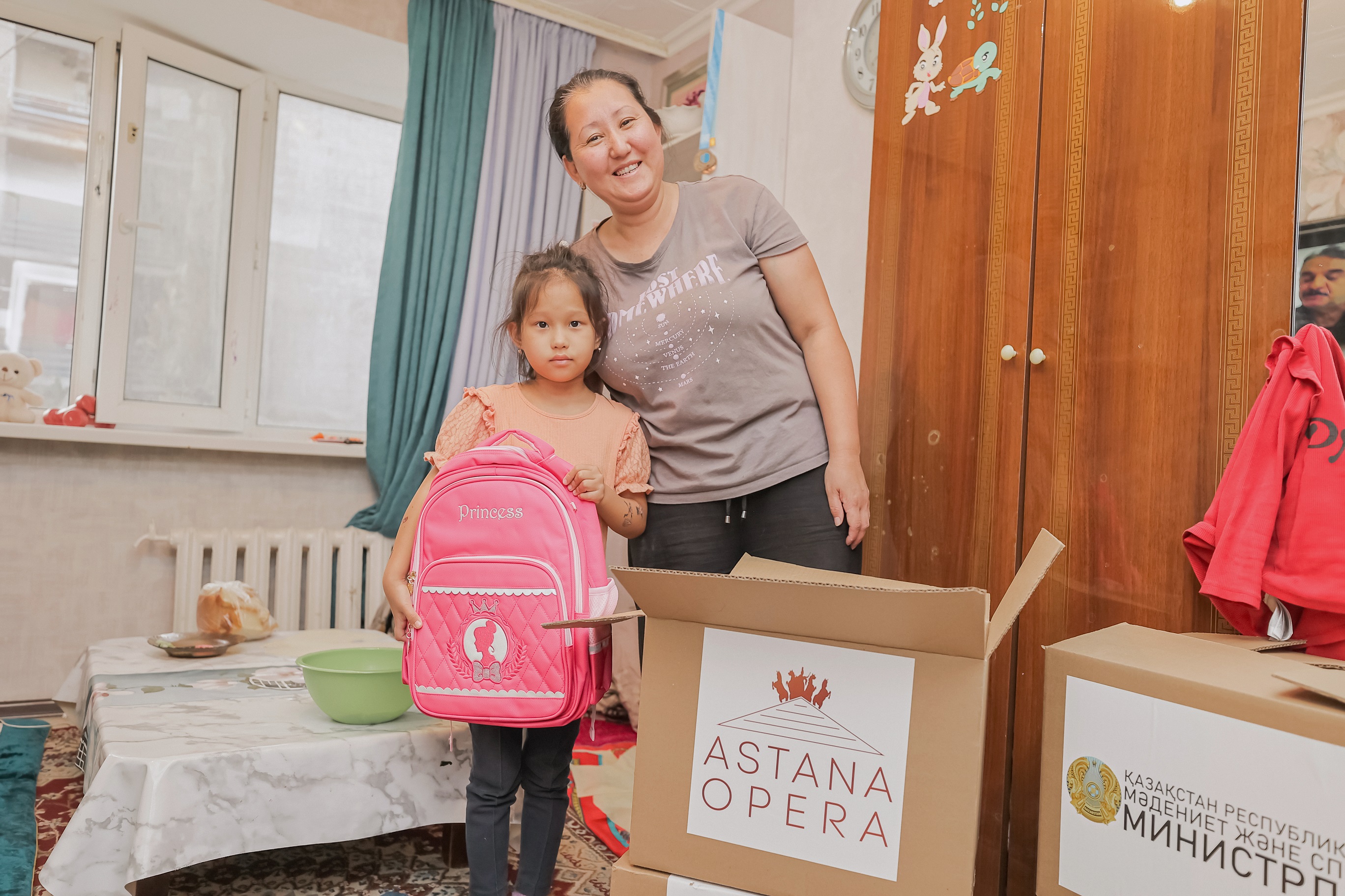 Astana Operanyń syılyq jıyntyqtaryna eń qajetti mektep jabdyqtary, atap aıtsaq, arqa qorjyndary, dápterler, qalamdar, qaryndashtar, syzǵyshtar, qalamsaýyttar, boıaýlar, ermeksaz ben ár balaǵa qajetti basqa da zattar engen. Teatr eriktileri arnaıy aralap júrip baqytty oqýshylarǵa syılyqtardy óz qolymen tabystady.