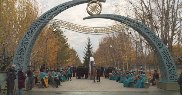 Alleıanyń kireberisine, ortasyna – qazaq halqynyń shańyraǵy, eki jaǵyna – ınstallıasııalyq úlgide mystan quıylyp jasalǵan dombyra men qobyz ornatylǵan.