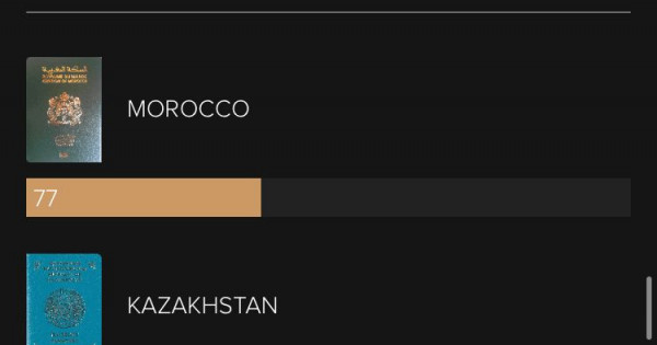 Qazaqstan Marokkomen birge 56-shy orynda tur. Ekeýi de 77 upaı alǵan. Qazaqstanǵa 37 eldiń azamattary vızasyz kire alady. Al 51 eldiń azamattaryna vıza alýǵa ruqsat berilgen.