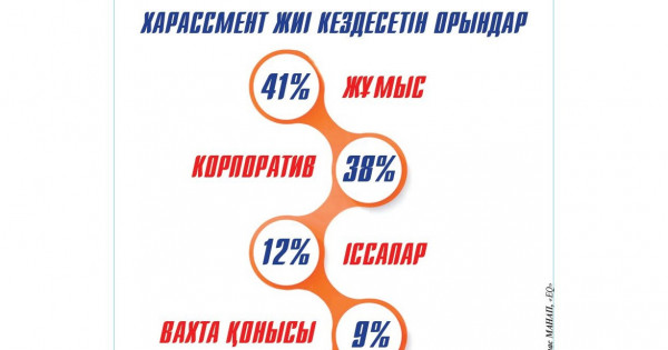 Respondentterdiń jartysyna jýyǵy (51%) Qazaqstanda jumys ornynda harassment pen zorlyqtyń bar ekenin rastady. Demek 300 myńǵa jýyq áıel ómirinde bir ret te bolsa jumys ornynda harassment pen zorlyqtan zardap shekken dep tujyrym jasaýǵa bolady. Harassmentke ushyraǵan áıelderdiń 57,6%-y bul faktiler birneshe ret bolǵanyn atap ótti. Iаǵnı 26 myńǵa jýyq áıel turaqty túrde jumystaǵy áriptesteri tarapynan ádepsiz jáne orynsyz is-áreketke shydap júr. Harassment eń jıi oryn alatyn jerler: jumys orny (41%), korporatıvtik is-shara (38%), qyzmettik issapar (12%), jataqhana, vahtalyq qonys (9%).